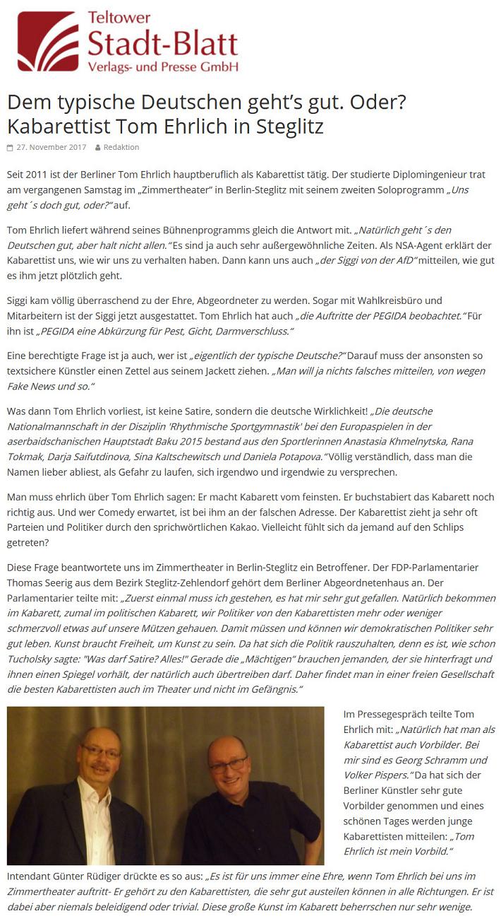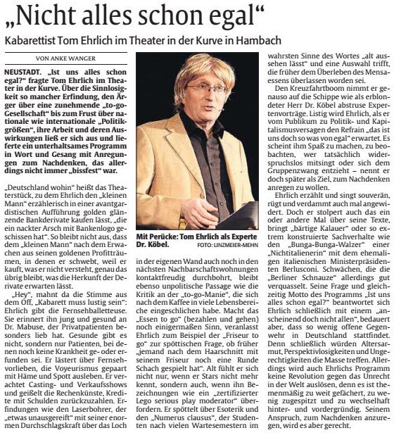 Für den im Bau befindlichen Flughafen konnte Tom Ehrlich sich Sepp Blatter vorstellen ("dann läuft alles wie geschmiert") und Pegida ist für ihn "Pest, Gicht, Darmverschluss". Als Moderator der "Sendung mit der Maus" versuchte er dem "Kleinkinder-Publikum" die Einkommensunterschiede in der Welt, vom Bauarbeiter bis zum Inverstment-Banker zu erklären und erntete dabei viele Lacher.